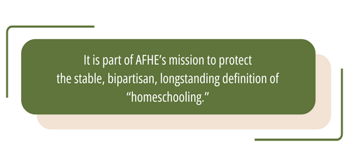 This is especially concerning when AFHE also sees bills introduced with language that does not carefully maintain the distinction between homeschool and ESA-funded home education. All Arizonans who care about homeschool freedom should be on high alert against legislative measures that would diminish the distinctions between homeschooling and government funded educational models. It is part of AFHE’s mission to protect the stable, bipartisan, longstanding definition of “homeschooling.”