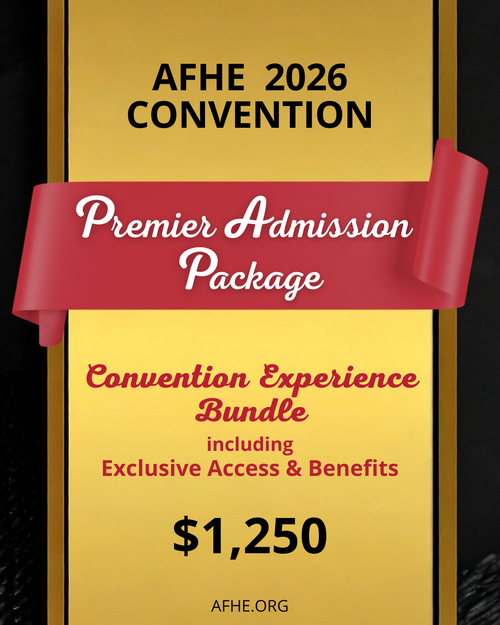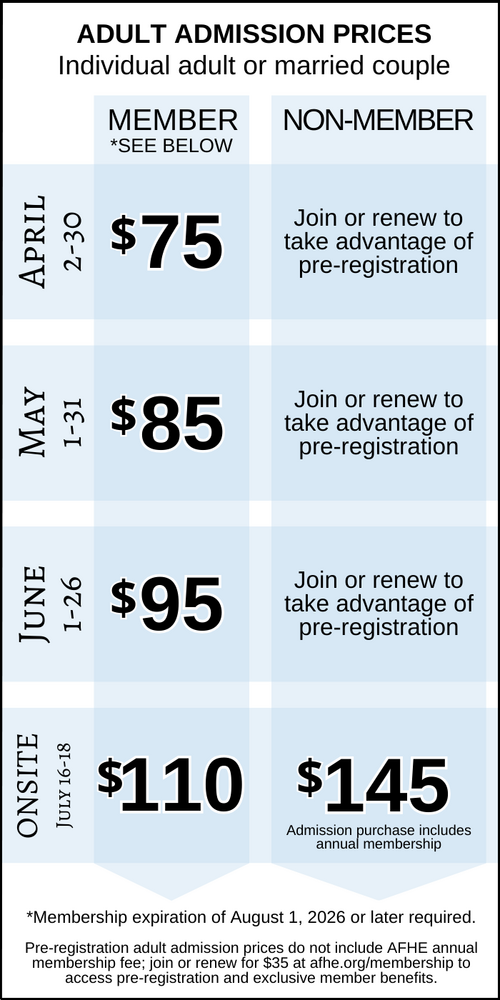 Adult convention admission fees do not include the per-family AFHE Membership annual fee of $35.